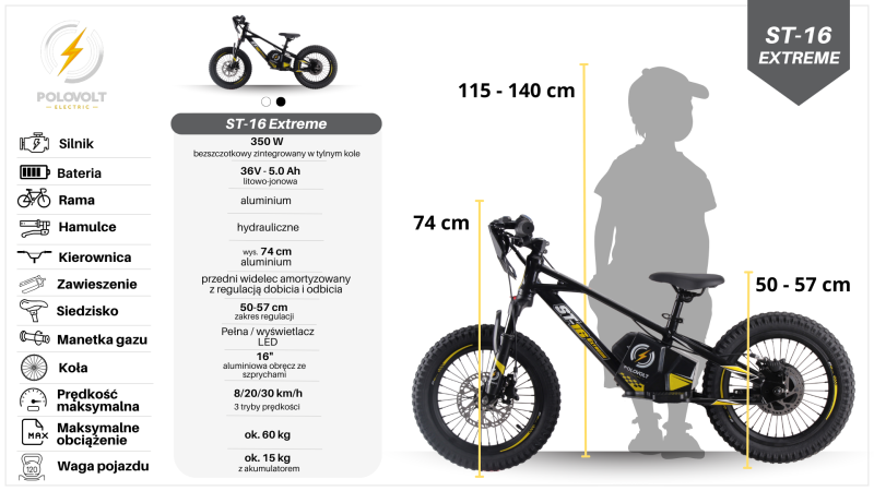 POLOVOLT 16 EXTREME to idealny elektryczny mini cross dla młodych pasjonatów jazdy terenowej. Niezależnie, czy dopiero zaczynasz, czy już szlifujesz umiejętności – ten model dostarczy Ci maksymalnej satysfakcji:
